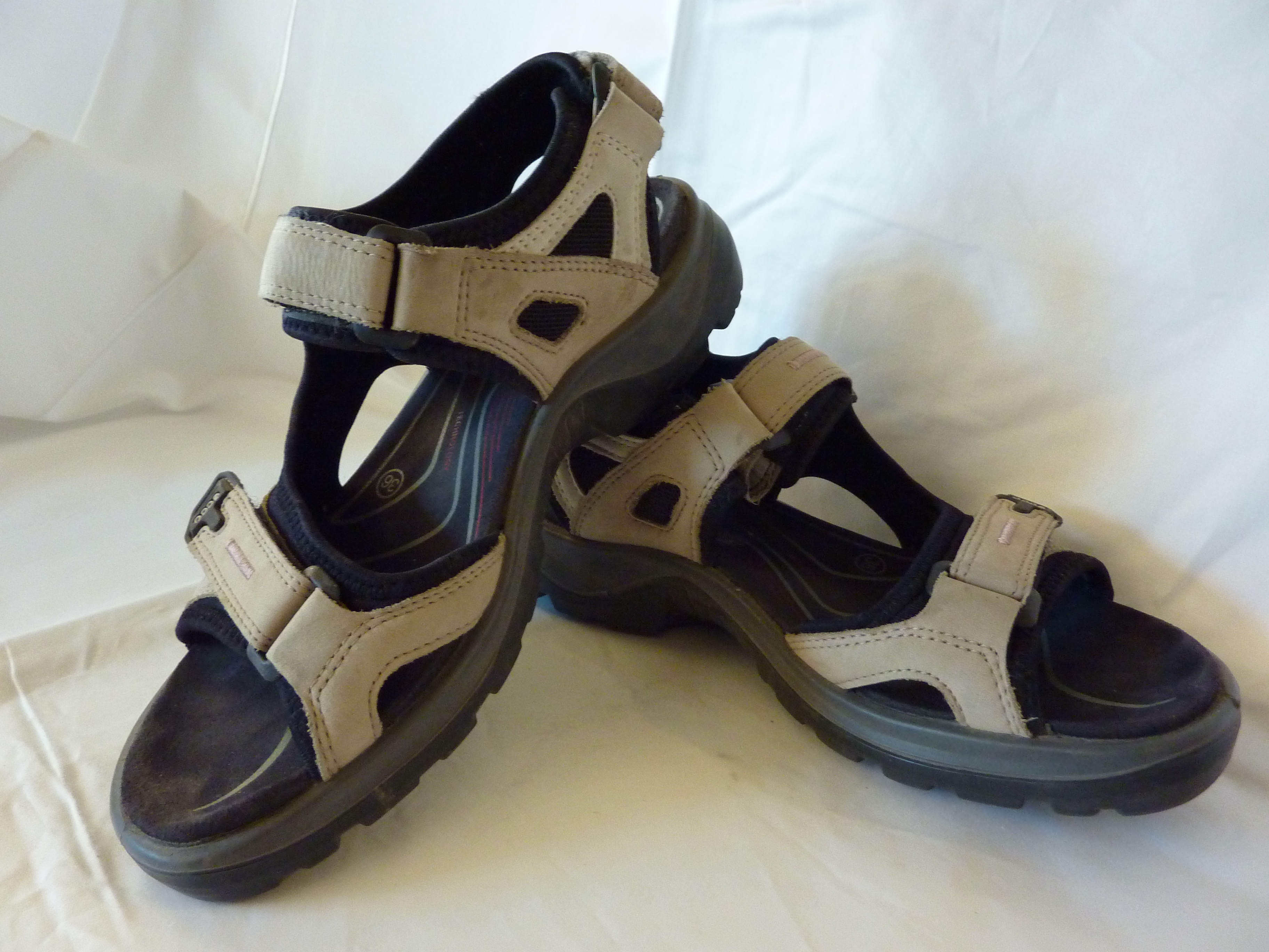 The ECCO sandals below are some of my favorite shoes for wearing when I know I’m not going to be going very far–less than a mile. Beyond that, though, they require too much effort to keep them on. My toes start to ache and the strap that goes in between my toes starts to rub.