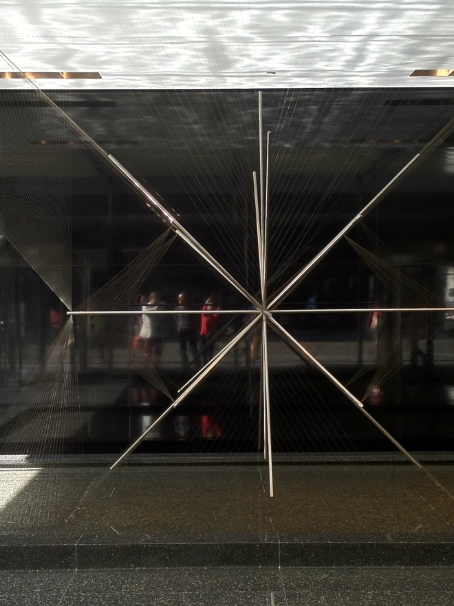 Richard Lippold’s Untitled (Radiant I) was locked up tight in the lobby of the Inland Steel Building on the day we visited, but we could still see it by pressing our noses and cameras to the glass. Taut wires of various materials zig zag out from criss-crossing steel rods, giving it the presence of a star radiating out from the dark sky. It was installed in 1957 and was the first abstract work of art to be on permanent display in Chicago.