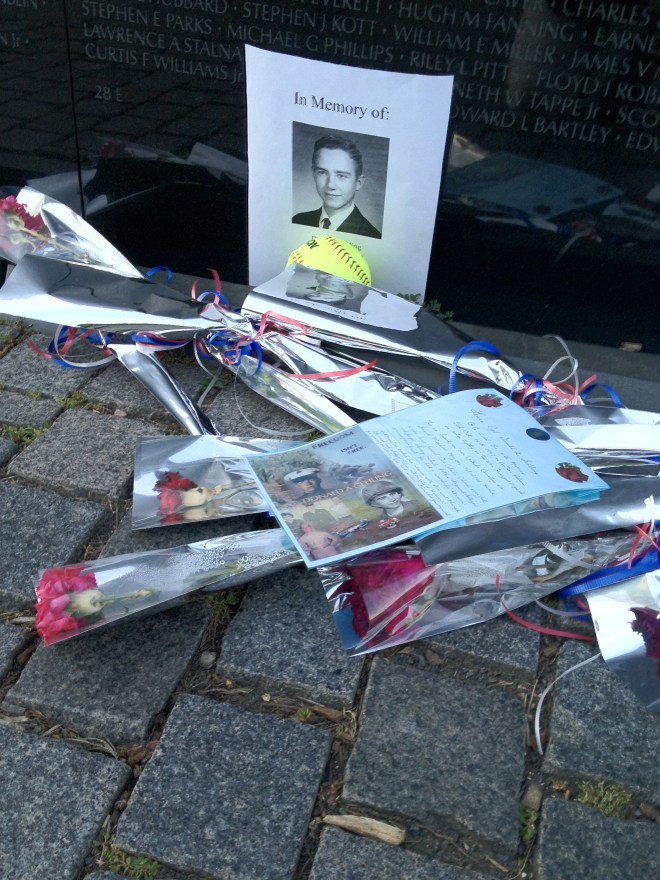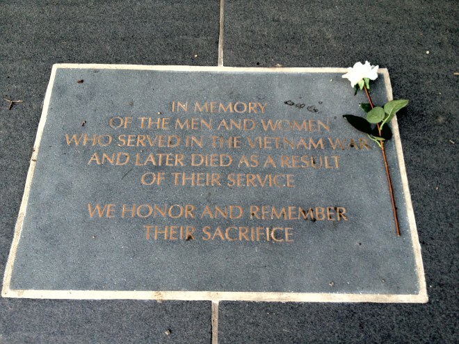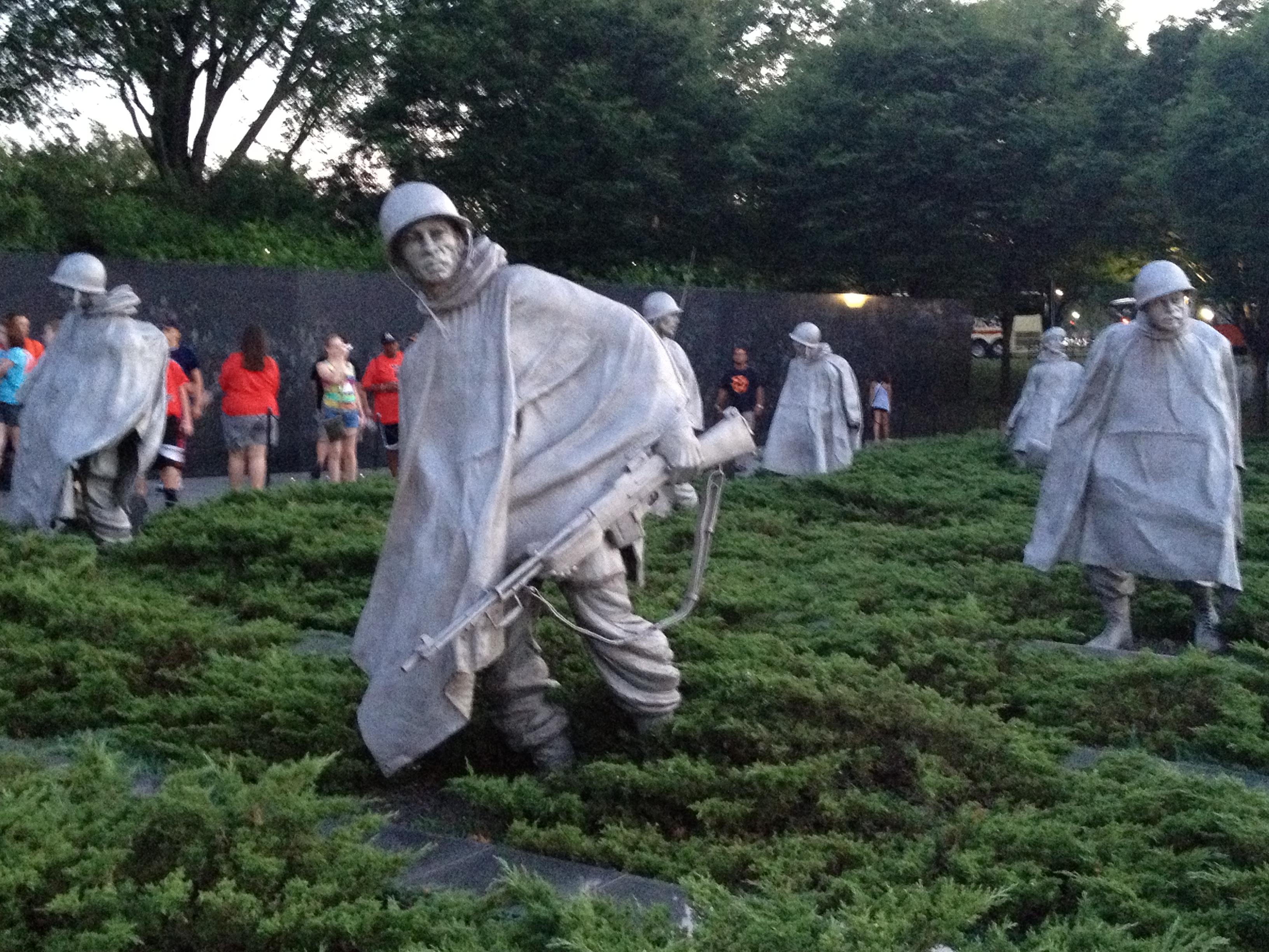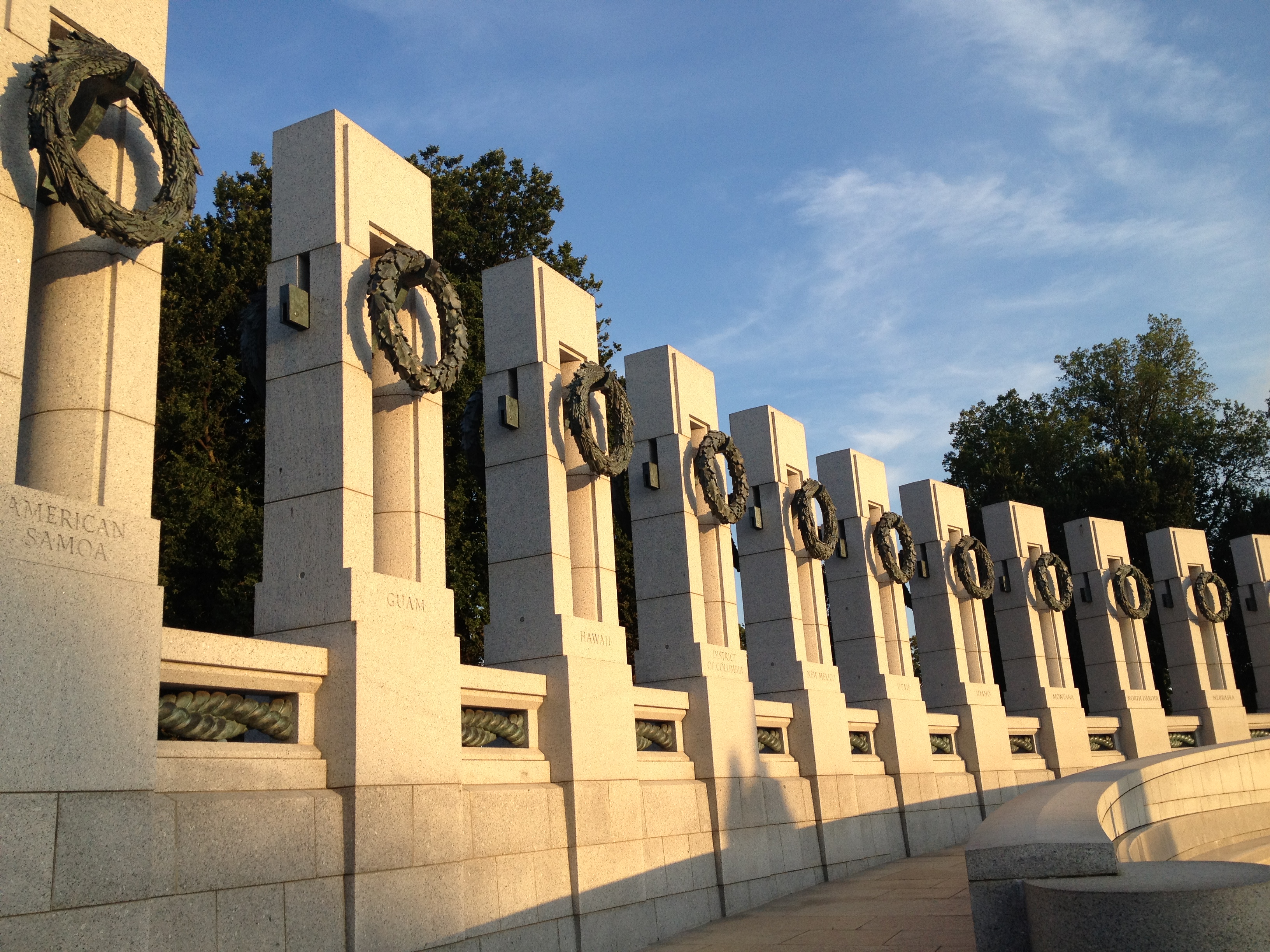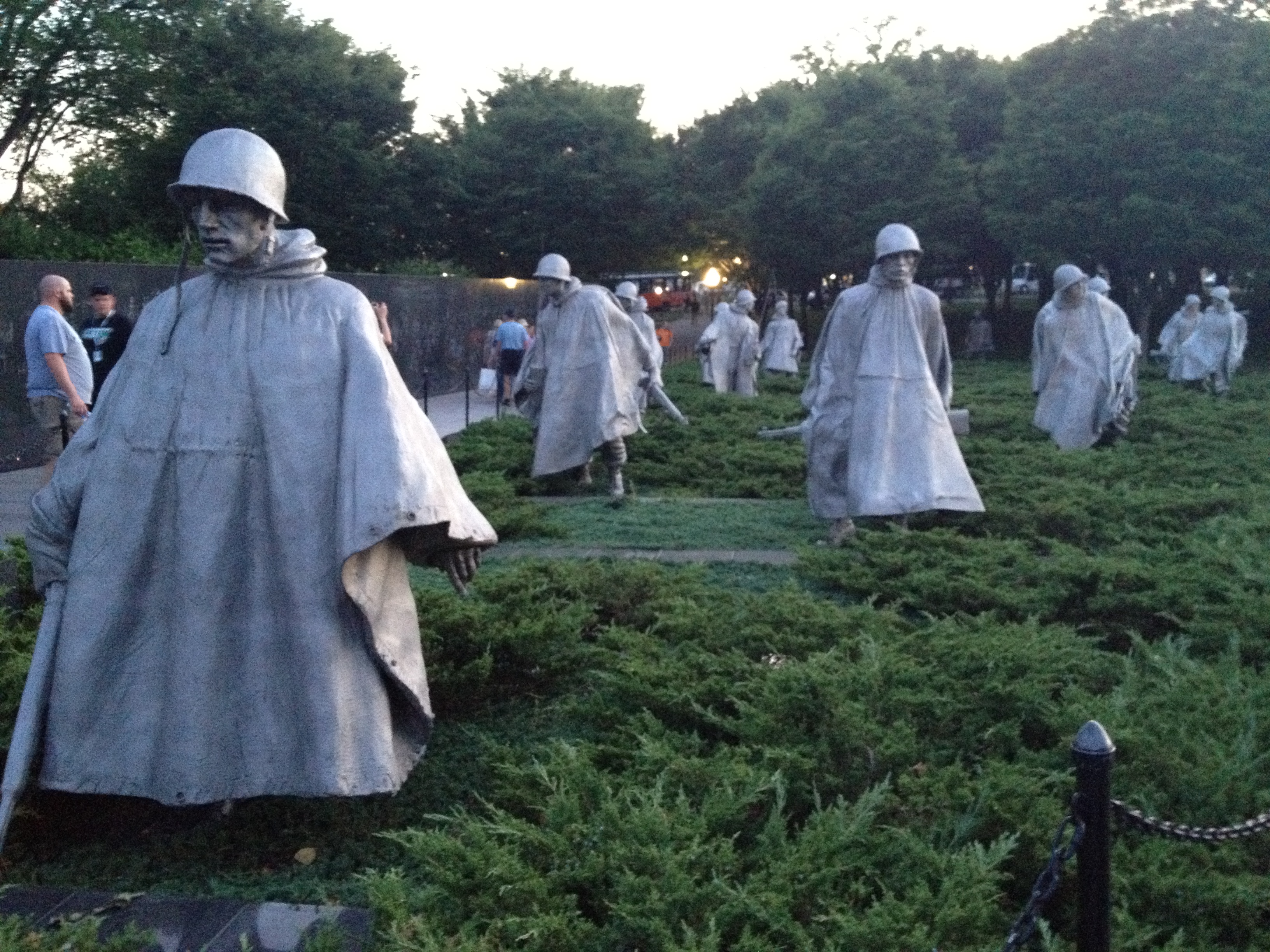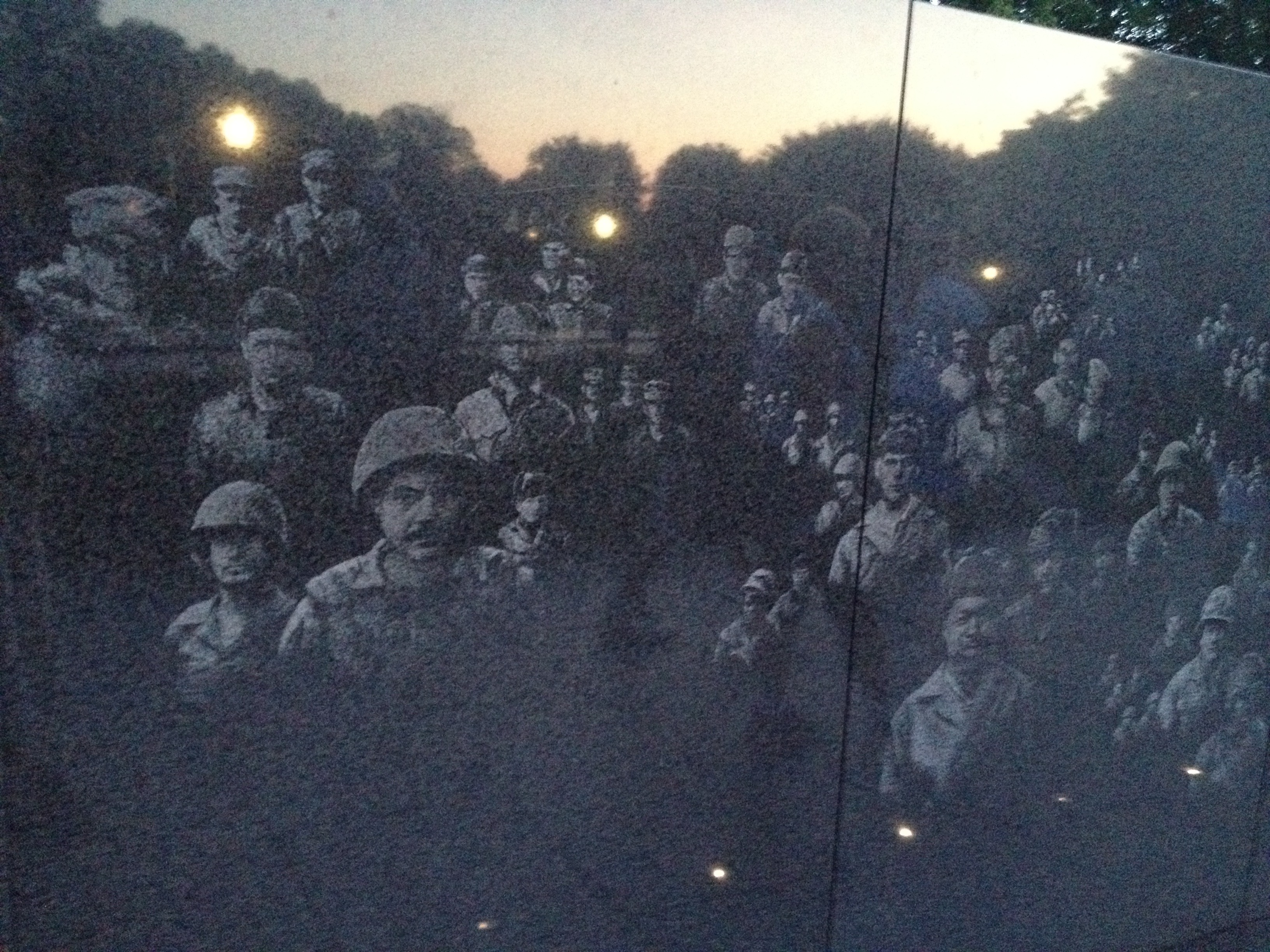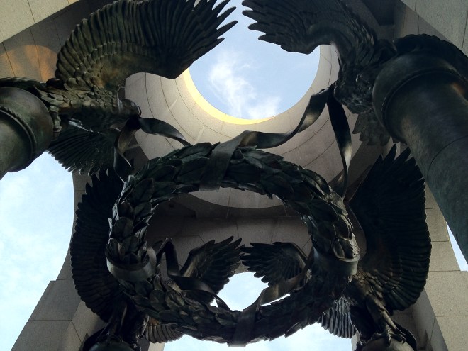 Hubby along the picturesque lake in Constitution Gardens, a memorial to the American Revolution and to the signers of the Declaration of Independence.Wreaths hung on posts naming all the states and American territories that contributed to the war effort during WWII.Eagles overhead in one of the two pavilions marking the two theaters of war: Atlantic and Pacific.Vietnam Veterans Memorial.Vietnam Veterans Memorial.Vietnam Veterans Memorial. This man’s name is inscribed somewhere on this wall.Vietnam Women’s Memorial.Korean Veterans Memorial.Korean Veterans Memorial.Korean Veterans Memorial.Korean Veterans Memorial.Lincoln Memorial.Lincoln Memorial.The spot on which Martin Luther King, Jr. stood during his “I Have a Dream” speech on the Lincoln Memorial.