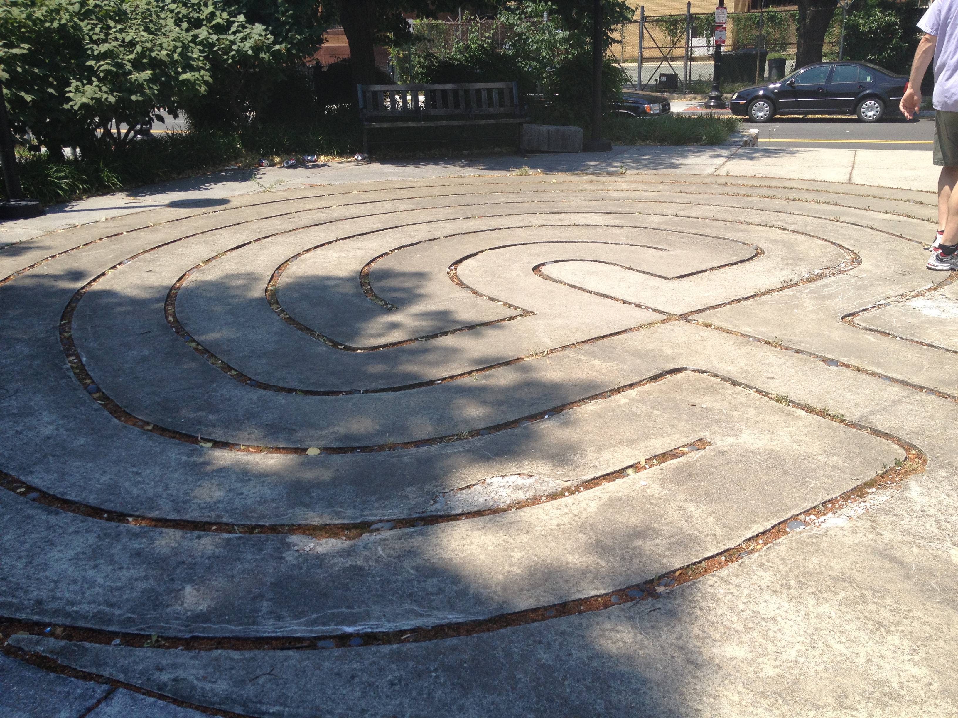A portion of a Walt Whitman poem is inscribed on the Metro station wall.Our guide, Carolyn, showing us what Dupont Circle used to look like. You can’t believe the mansions!The Dupont Circle Fountain, which has symbols for the sea, the stars and the wind–all important to the naval officer for whom the circle is dedicated. The trash around the fountain is unusual, we were told, left-over from the celebrations of the day before.A tiny park near Dupont Circle which commemorates the entertainer, the entrepreneur, the statesman, Sonny Bono.“Toy Theater” mural by Peter Waddell is on the side of a building located at 1914 Sunderland Place NW at New Hampshire.An Episcopalian church was burned by arsonists in the 70s. What you see here is what is left of the original altar in the interior of the building. As you can see, the congregation is gearing up to rebuild, incorporating the ruins from the building.A labyrinth to walk outside the ruins of the Episcopalian church.The Cairo–the tallest building in the city. (It’s not the Capitol Building!) Once it was built, everyone worried that DC would be overrun with massive structures, so a law was passed that says no building can be taller than this one.