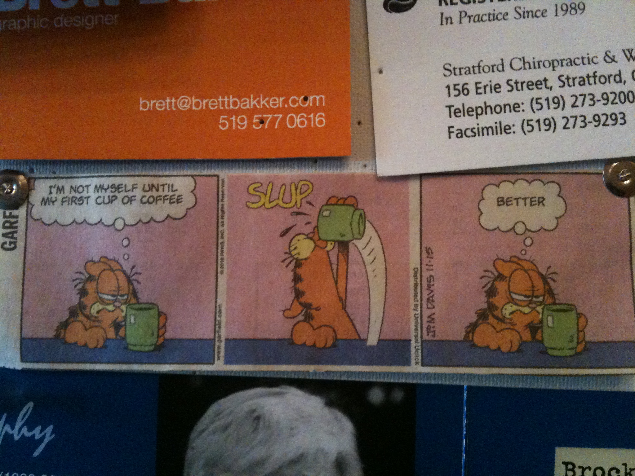 Sputnik Espresso BarSaw this cartoon last year at Sputnik. It is applicable to me any day of the year. Thankfully, there are places like Sputnik all over Stratford to help make things better.