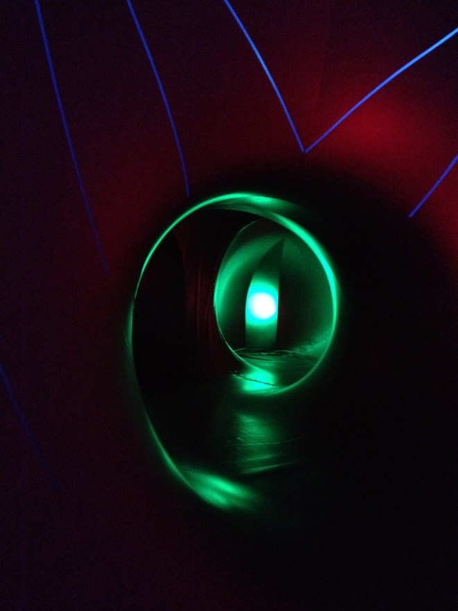 As for the main exhibit, Mirazozo, it’s hard to describe what it is, exactly. It sort of feels like part bounce-house, part cathedral. The walls are made of thin sheets of plastic, so thin that they are flexible and feel like fabric. Air is pumped into the structure and light from outside filters through stripes and designs to create a stained-glass effect.