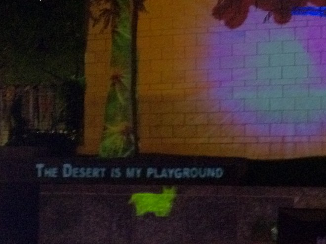 As we walked on, we saw a juggler tossing large, illuminated yoyos and bowling pins into the air and catching them with ease. There were long sticks that looked like the big brothers of desert plants rooted into containers. When pushed, the plants made music. One structure looked like a giant, neon agave plant, but when we touched it, we discovered it was made out of pool noodles. Art was projected up onto the blank walls of surrounding buildings and white shade sails overhead. The light from the projections spun before and over us as another artist, perched on a scaffolding, took pictures of people interacting with the art below.