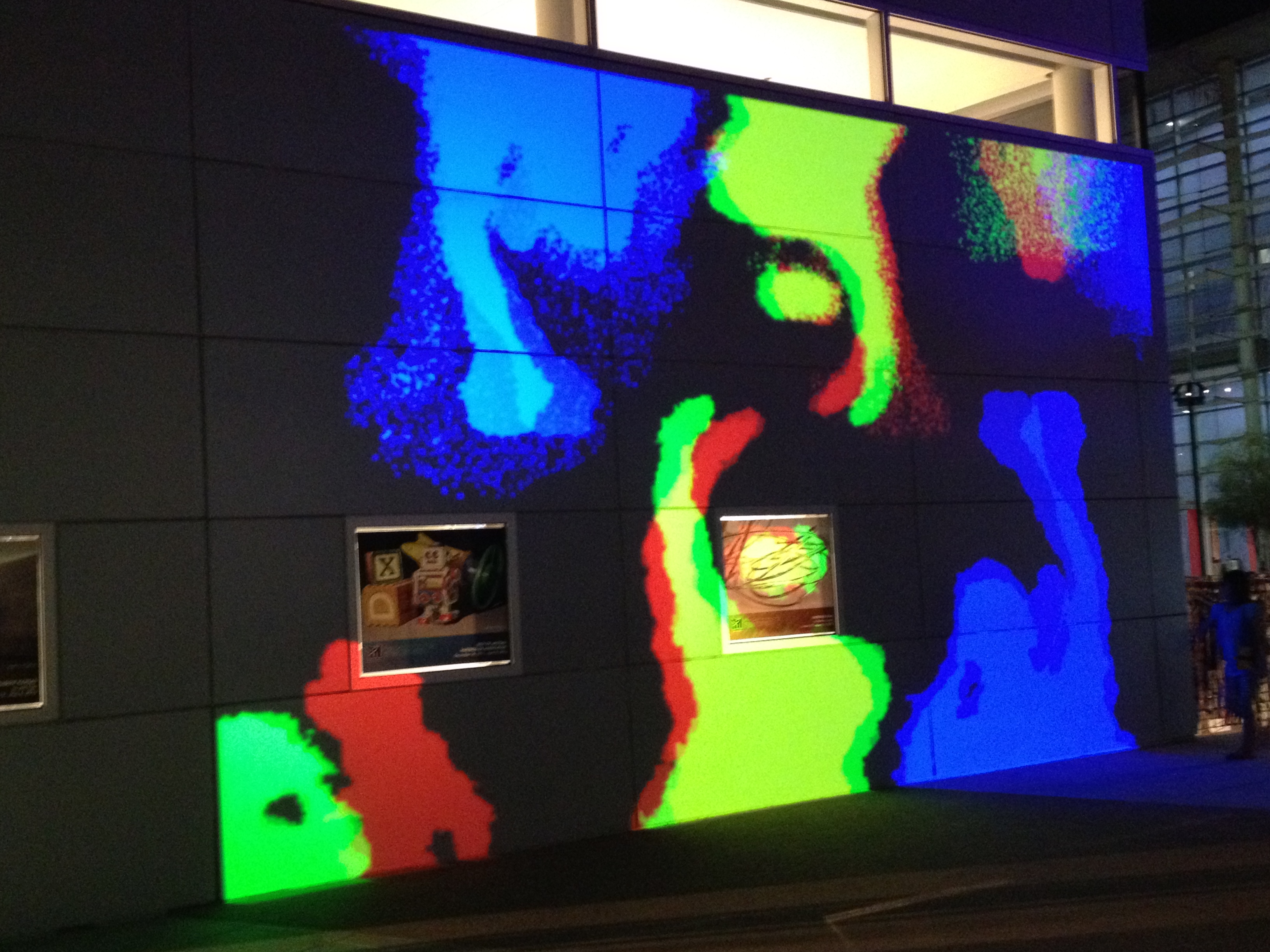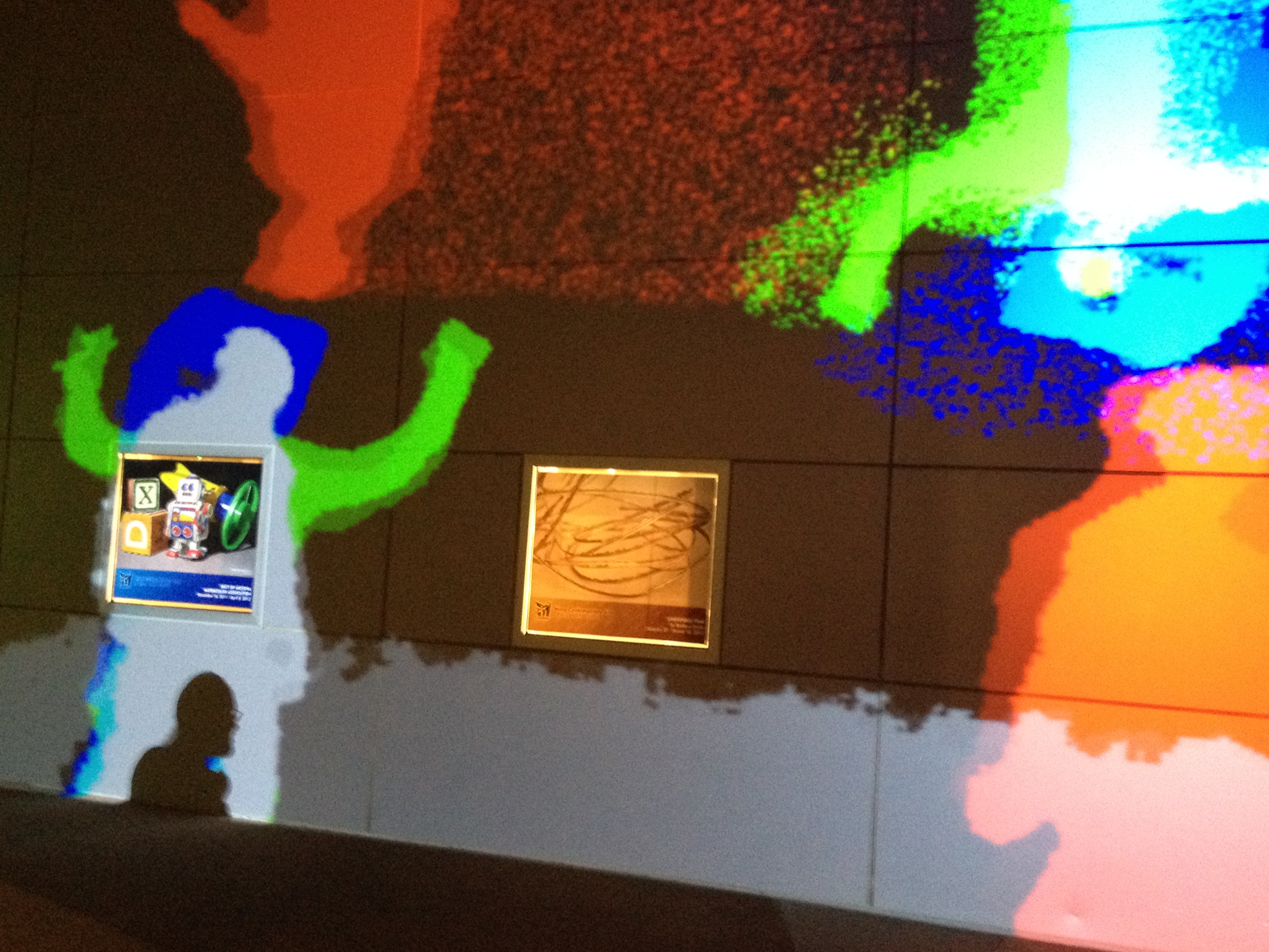 A favorite piece for both of us was the video wall where passersby became the art. As we walked by, a camera caught our silhouettes and projected them on the wall of the Contemporary Art building. When we moved, the projections moved, and then divided and flipped, and suddenly, what was two images of our silhouettes became four and six and upside down. It brought out the kid in everyone who passed by. Old men with canes were trying to make the projections more outlandish than before. Kids were hopping up and down to make the images jump.