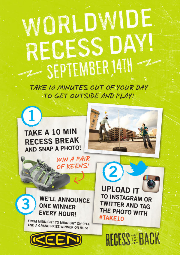 Recess is Back and KEEN challenges you to get out and play for at least 10 minutes on September 14th. Take a photo of your playtime, upload it to Instagram or Twitter with the hashtag of #TAKE10, and you could win a pair of KEEN shoes!